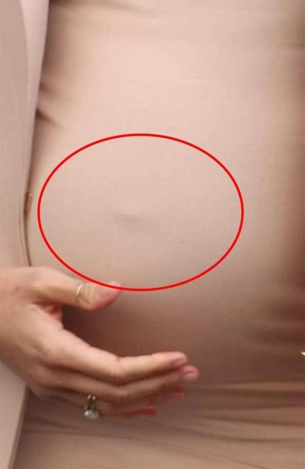 这是2019年1月梅根访问国家大剧院式时所拍摄的,她身穿一身裸粉色的紧身裙,露出了孕肚圆滚滚的形状。梅根用手抚摸着肚子,这是她常有的习惯。当拉近镜头来看,梅根肚子里的小家伙似乎用小手或者小脚踢了一下妈妈的肚子,从下面这张动图就能看出这神奇的一幕。