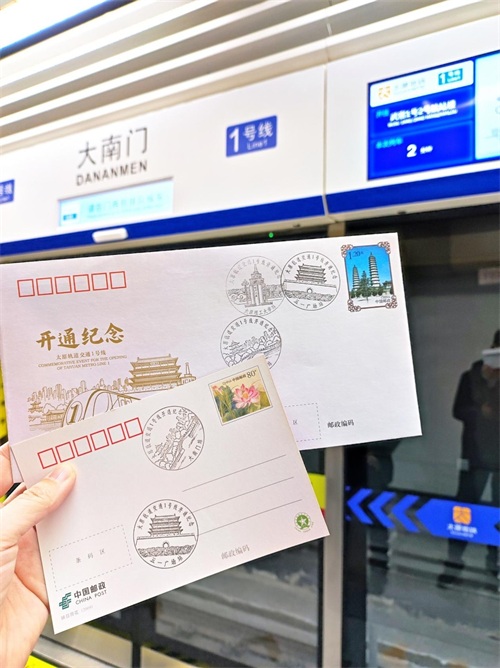 太原邮政与太原轨道交通集团有限公司携手设计开发了“太原地铁1号线开通”纪念封、明信片及纪念戳。在1号线开通当天,分别在沿途的广场站、大南门换乘站及太原理工大学站同步开展首日发售活动,同时在车站营业厅、迎泽西营业厅开办加盖双塔风景和实寄日戳业务。