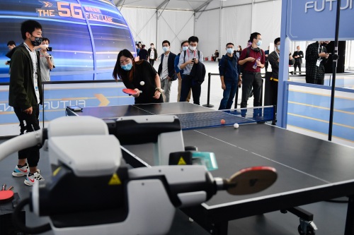 10月19日,观众在展馆体验乒乓球发球机器人的发球训练。 新华社记者 黄宗治 摄