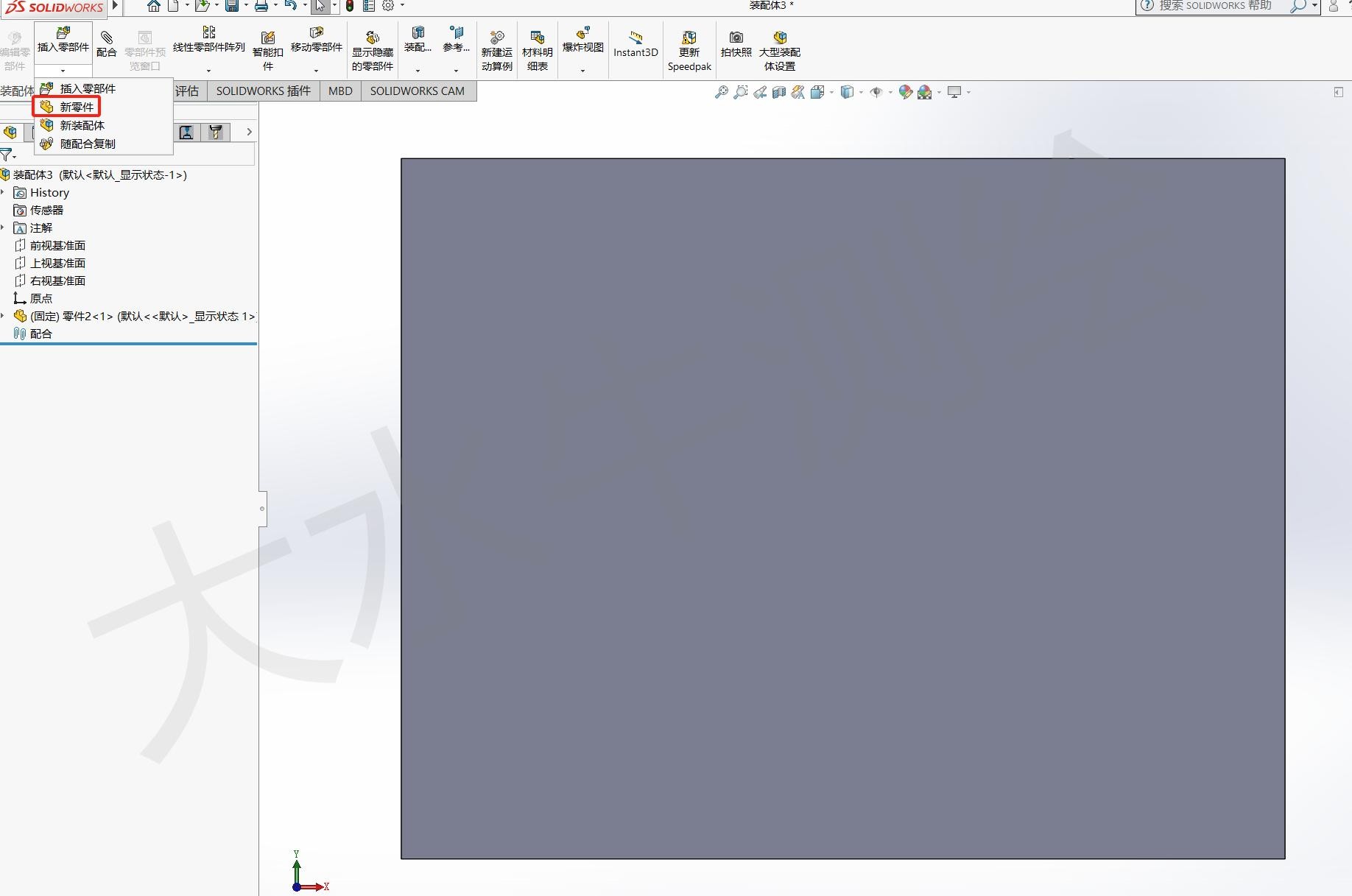 如果没有提前绘制好的零件,我们可以选择【新零件】,直接在此装配体中绘制。