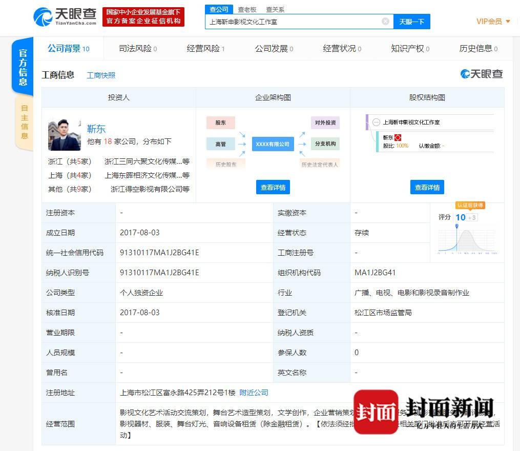 该公司由知名演员靳东全资持股,成立时间为2017年8月,经营范围包括影视文化艺术活动交流策划,舞台艺术造型策划,文学创作,企业营销策划,展览展示服务等。