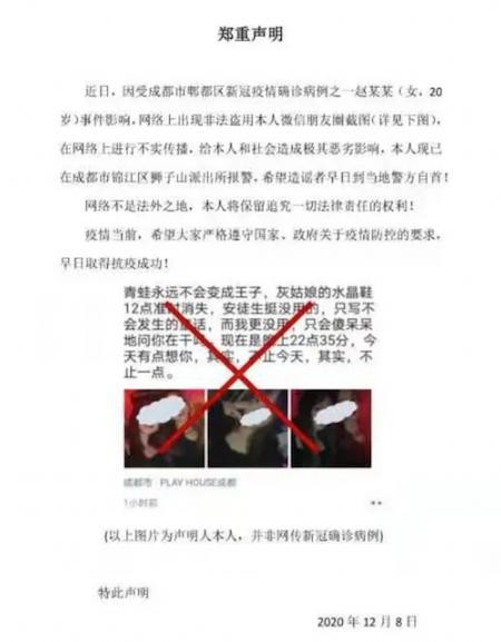12月8日,照片的“主人”在网上发布声明辟谣称,自己的朋友圈截图被“冒用”了,自己已去医院做了核酸检测,已有结果就会公布,也希望大家不要再发她照片,此事已对她的生活和工作造成了很大影响。