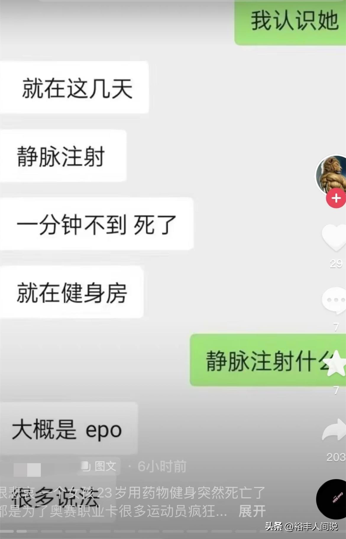 “我听说的,是她训练前静脉注射了一针,然后训练的时候就死在了健身房。”