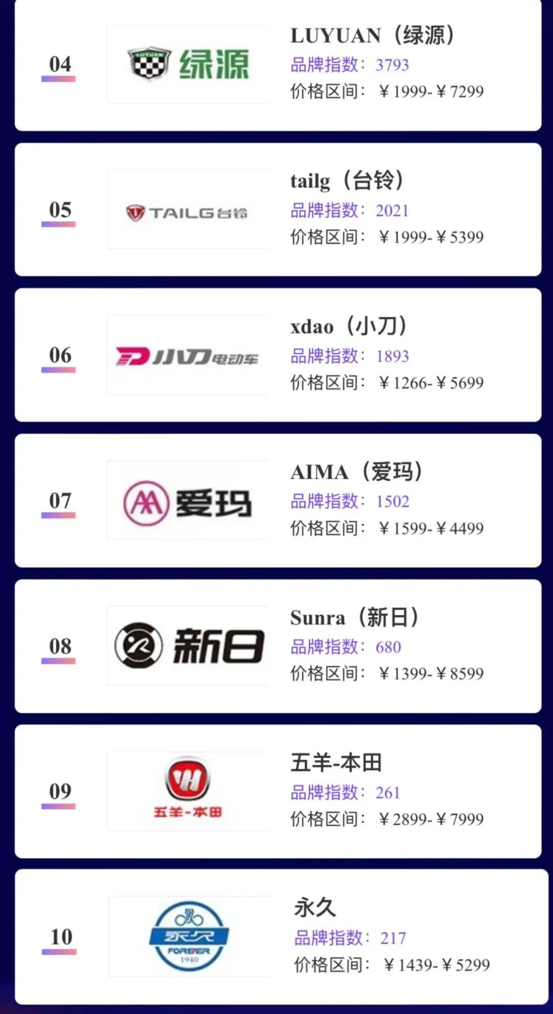 除了上述这5大品牌外,排名第6至第10的分别是小刀、爱玛、新日、五羊-本田、永久。其中爱玛掉到第7的排名,还是让人比较意外的。毕竟以前雅迪、爱玛这两大品牌,经常都占据榜单前列,而当下随着电动车行业内卷加剧,品牌也只有不断推动技术革新、加大竞争优势,才能获得消费者认可。