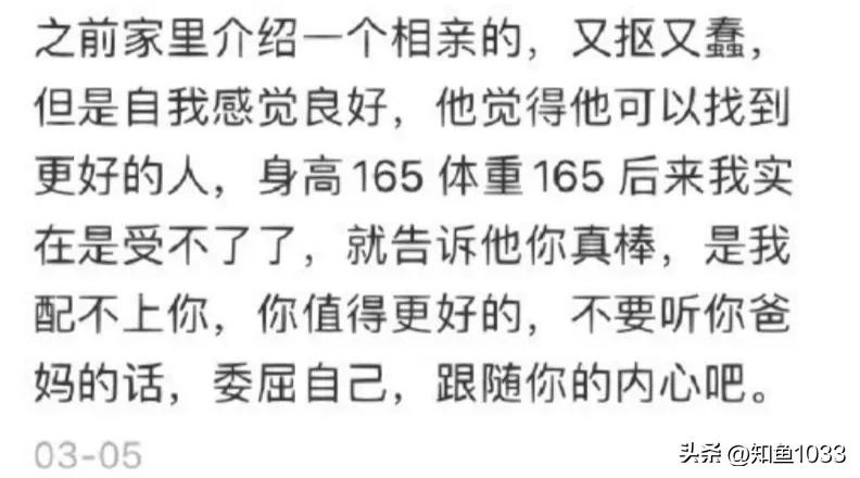 之前家里介绍一个相亲的,又抠又蠢,但是自我感觉良好,他觉得他可以找到更好的人,身高165体重165后来我实在是受不了了,就告诉他你真棒,是我配不上你,你值得更好的,不要听你爸妈的话,委屈自己 跟随你的内心吧。