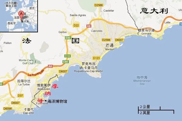 摩纳哥位于欧洲西南部,三面被法国包围,摩纳哥三边被法国阿尔卑斯省接壤,一面直接临地中海,中心距离意大利大约为16千米,距离尼斯东北部为13千米,摩纳哥总面积为2.08平方千米,是世界上第二小国家。摩纳哥地处地中海北岸丘陵山地,这里地形比较陡。摩纳哥境内海拔最高点为164米,最低处为地中海岸边。摩纳哥为5.47公里陆地边界和3.83公里海岸线。摩纳哥是世界上海岸线最短国家,海上主权延伸到22.2千米,宽度为349—1700米之间。