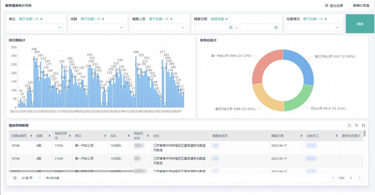 为了更好地展示稽查数据,设计了一个数据看板,可以通过多项条件选择进行筛选,更加直观地对实时稽查情况和历史稽查数据进行统计分析。彻底取消了车队、分公司统计人员对这方面的统计工作,集团服务管理部可以直接从后台调取下载所有数据。
