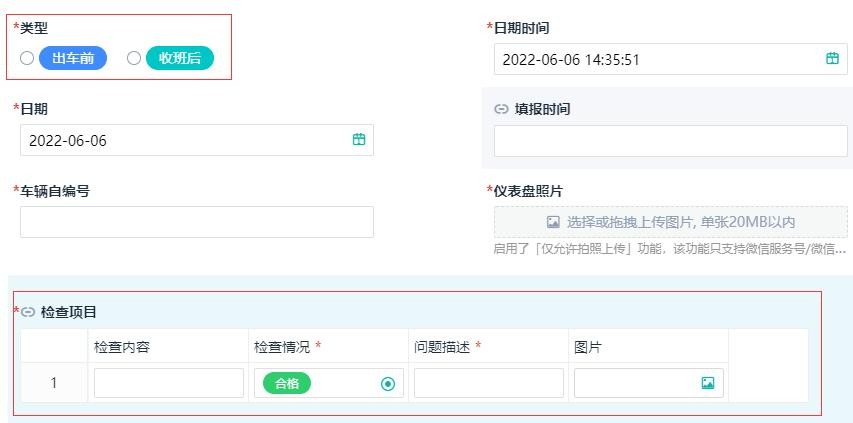 首先建立检查科目数据表,把检查类型和科目关联起来。表单上的检查科目通过“子表单”控件实现,在其中增加相应内容控件。通过“数据联动”功能,实现选择检查类型关联出检查科目。为了简化驾驶员的操作和页面布局,设置了默认所有检查科目初始合格,当检查到不合格的科目,手动选择不合格,此时在科目后面显示出“问题描述”和“图片”,方便驾驶员进一步填报内容。此项功能通过设置一条“显隐规则”实现。