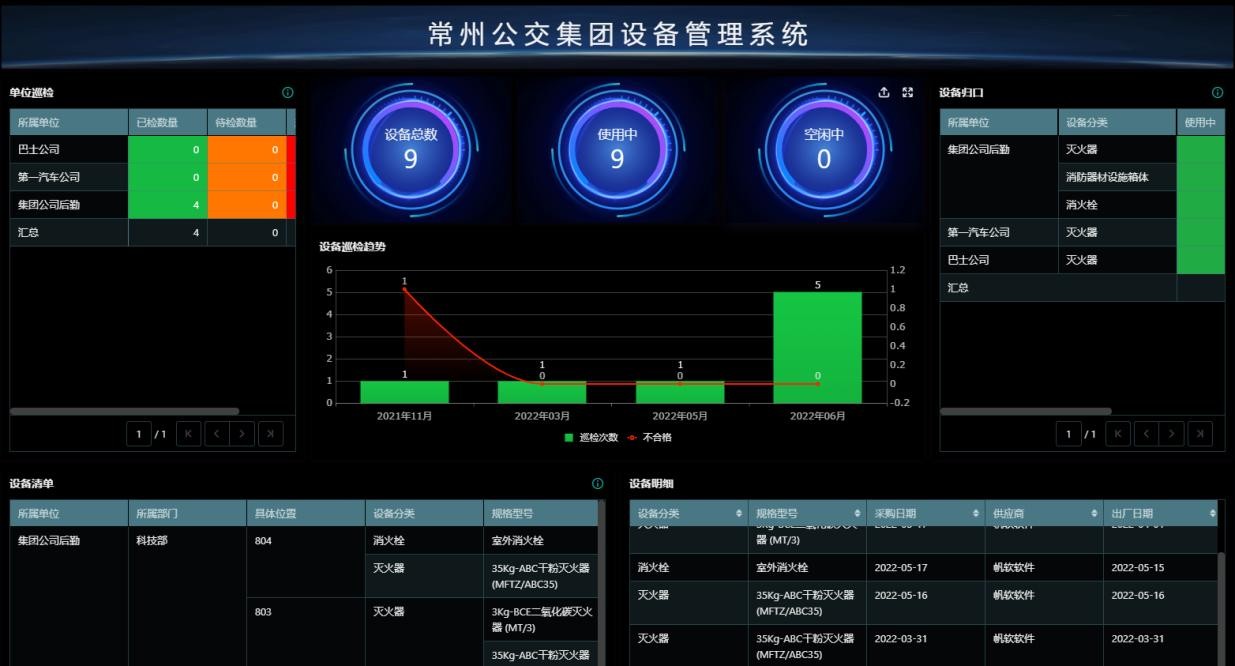 常州公交建立了“设备基础信息”、“设备巡检”、“设备调整”、“设备维保”、“基础配置”以及三个数据看板等模块,覆盖了设备的全生命周期管理。