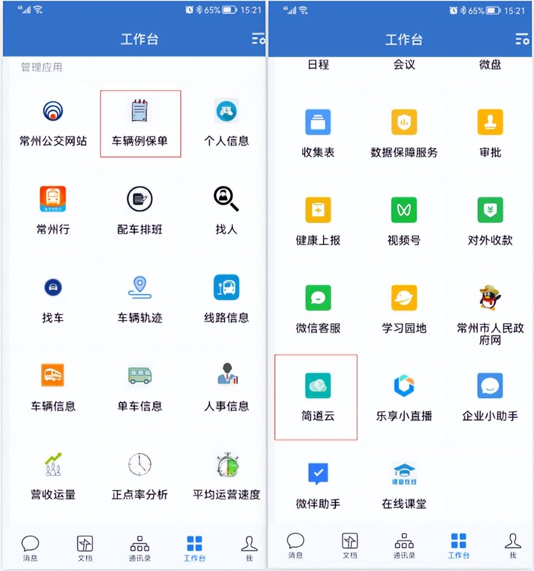 常州公交已经全面使用企业微信,企业微信是公司移动端应用的统一平台。在使用“简道云”之初,就把两者绑定起来。通讯录、组织架构全部进行了同步,流程信息推送直接推送到手机端的企业微信里,这样“简道云”就完美地融入了移动应用平台。应用的操作入口是企业微信-工作台-车辆例保单,或者直接进入“简道云”模块。