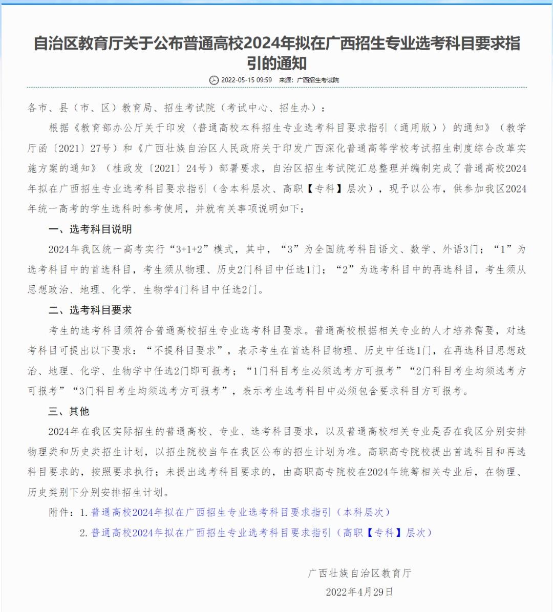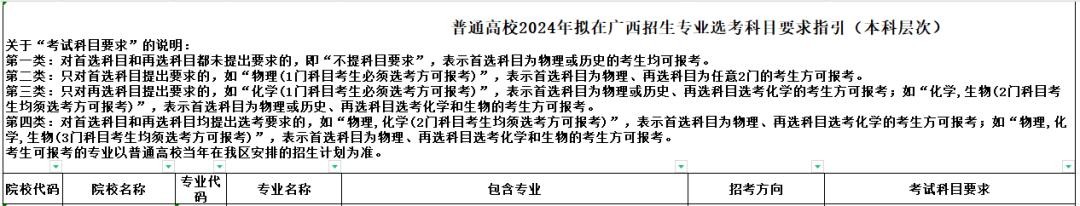 广西招生考试院在2022年时就发布了《自治区教育厅关于公布普通高校2024年拟在广西招生专业选考科目要求指引的通知》,公布了普通高校2024年拟在广西招生专业选考科目要求,供参加广西2024年统一高考的学生选科时参考使用。