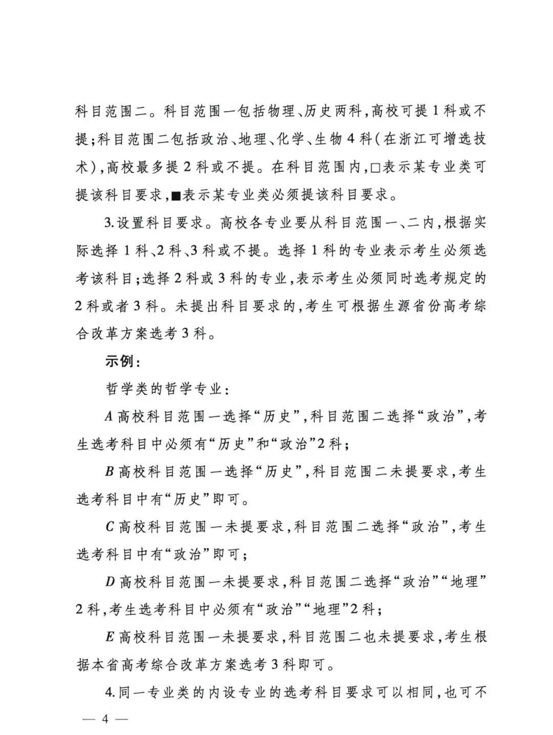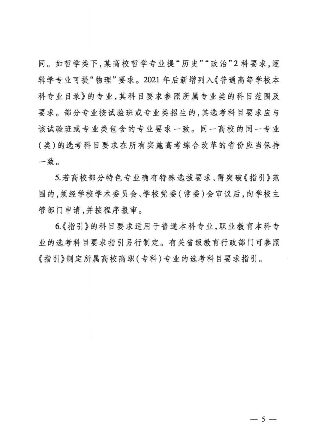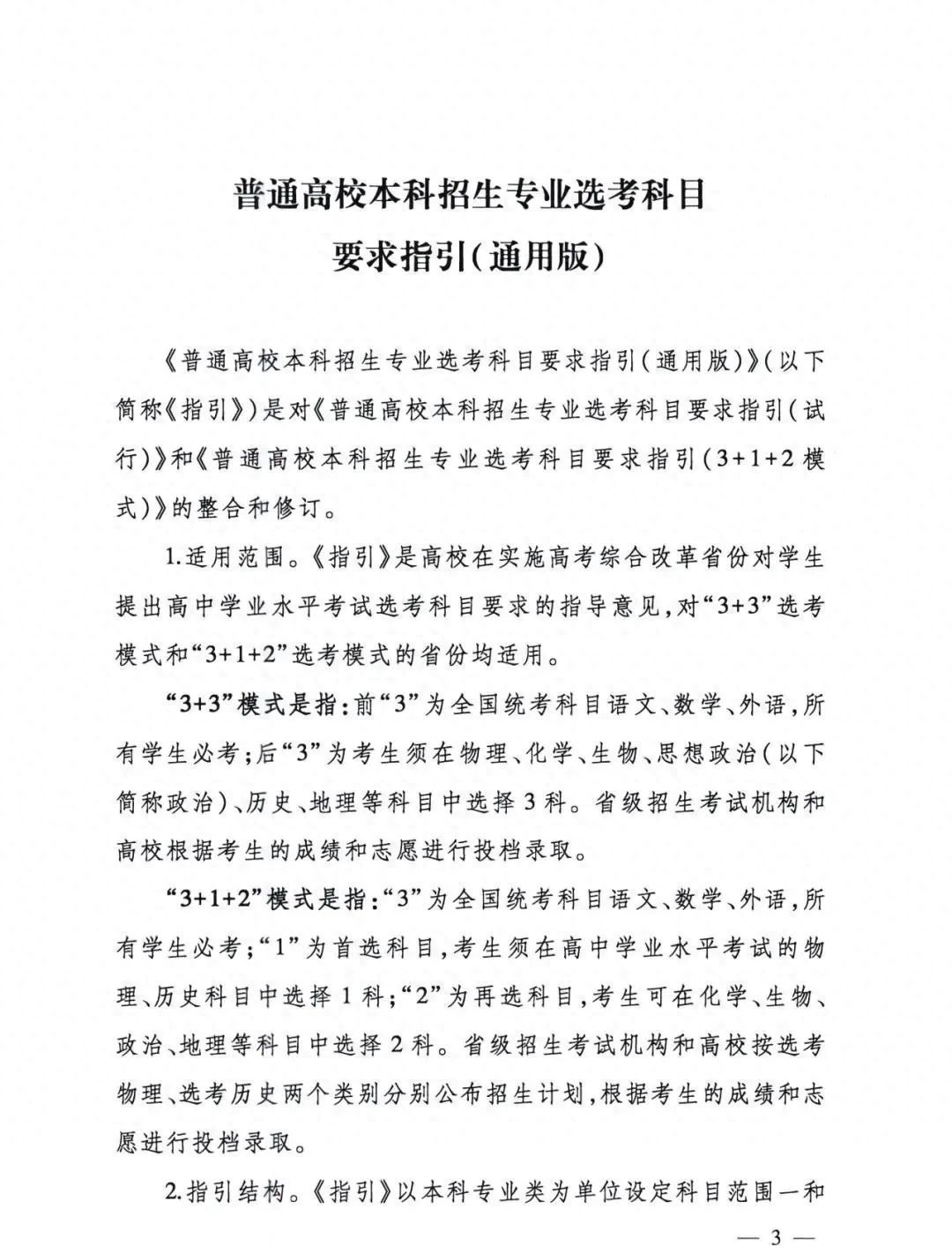 2021年,教育部办公厅印发了《普通高校本科招生专业选考科目要求指引(通用版)》通知,对高校各专业的选科要求作出了明确的规定。《通知》中明确:“《指引》是高校在实施高考综合改革省份对学生提出高中学业水平考试选考科目要求的指导意见,对“3+3”选考模式和“3+1+2”选考模式的省份均适用。”