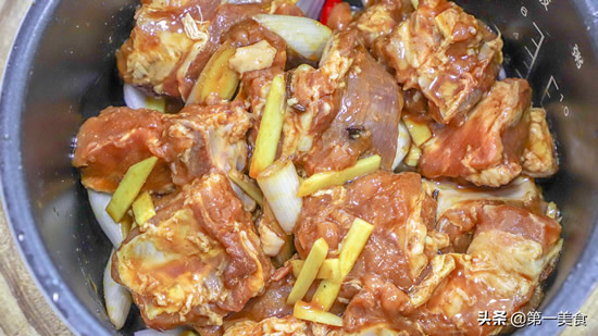 3.准备洋葱半个,切成片,放入电煲锅中抓散。大蒜几粒,从中间切开,再放入两个小米椒。然后把腌好的排骨放入锅中,浇上腌制排骨的原汁,再淋入适量香油。