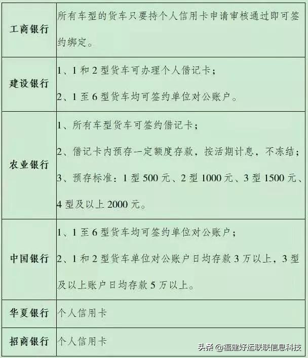 支持货车办理的银行:工商银行、建设银行、农业银行、中国银行、华夏银行、招商银行,签约条件如下: