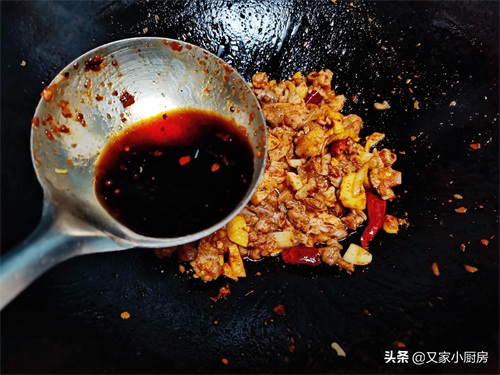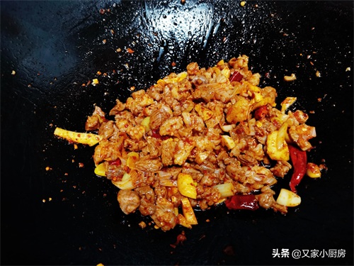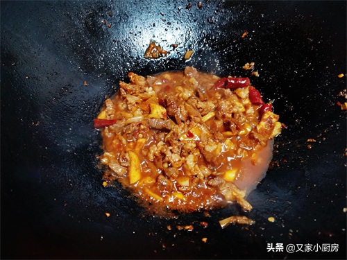 第三步,待肉里的水气完全没有后,放入葱、姜、蒜和干辣椒段炒出香味,再放入辣椒粉炒出辣椒红油。注意:我选用的辣椒粉辣味不太重,辣椒能起到去腥增香的作用。