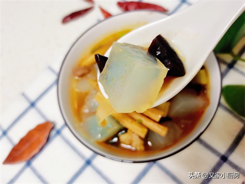 第七步,等待下入的配菜,煮熟,我们就可以把切好的粉块下入锅里,粉块大小2厘米左右就可以,我用绿豆淀粉自制的凉粉,做法我在以前文章也分享过。凉粉下入锅里受热就会变透明,不建议煮的时间太久,水开就可以最后调味了。