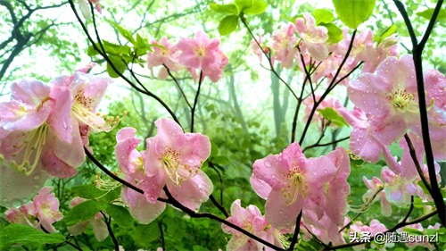 野生杜鹃具有顽强、坚韧不屈的特性,敢于与料峭搏寒。在恶劣的环境下,毅然能够绽放生命,点燃荒芜的山岭沟壑——团团簇簇、明艳灿烂,犹如仙女指弹七彩祥云,化成万千花雨,飘飘洒洒而来,点缀着暮春里空蒙的山色。