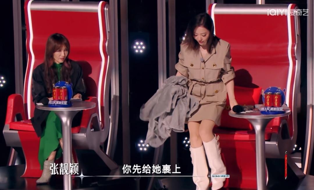 新声召集人张靓颖很疼惜这些00后新声歌手,看着他们在寒风里唱完,第一时间就递上毯子让他们保暖。