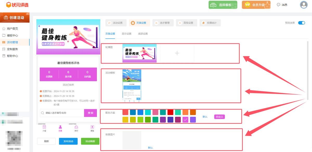 首先,在任意浏览器地址栏中输入网址https://www.zypx123.cn,进入状元评选-免费微信投票制作平台-公众号投票制作系统-网络投票评选创建上,完成账号的注册登录后,系统会自动跳转至活动后台,在【模板中心】,选择合适的模板样式。