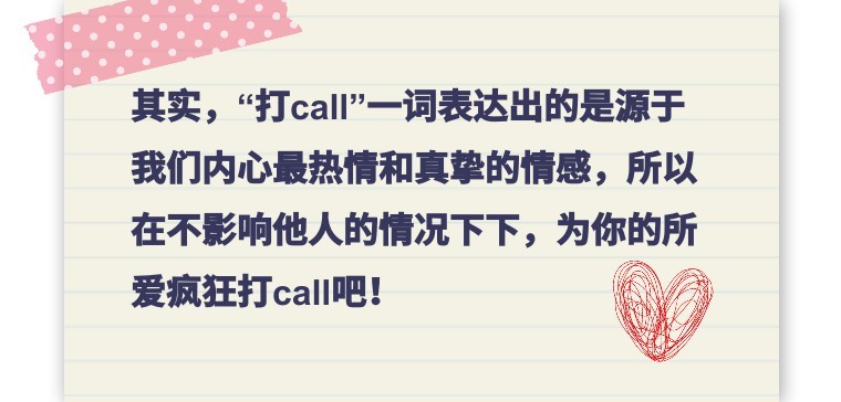 为了表示对台上偶像歌手的肯定和支持,粉丝们跟着节奏挥舞荧光棒、喊加油打气,一起打造热烈的气氛。而如今“疯狂打call”不仅仅适用于这种偶像应援活动,当你表达对某个人、事、物的支持时也可以用作“为xx疯狂打call”。