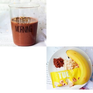 6⃣浓情可可香蕉坚果奶昔牛奶,可可粉1小勺,坚果1小把,香蕉一起放入榨汁机,这个奶昔真的爱了,巧克力香浓郁,就是热量会比较高。