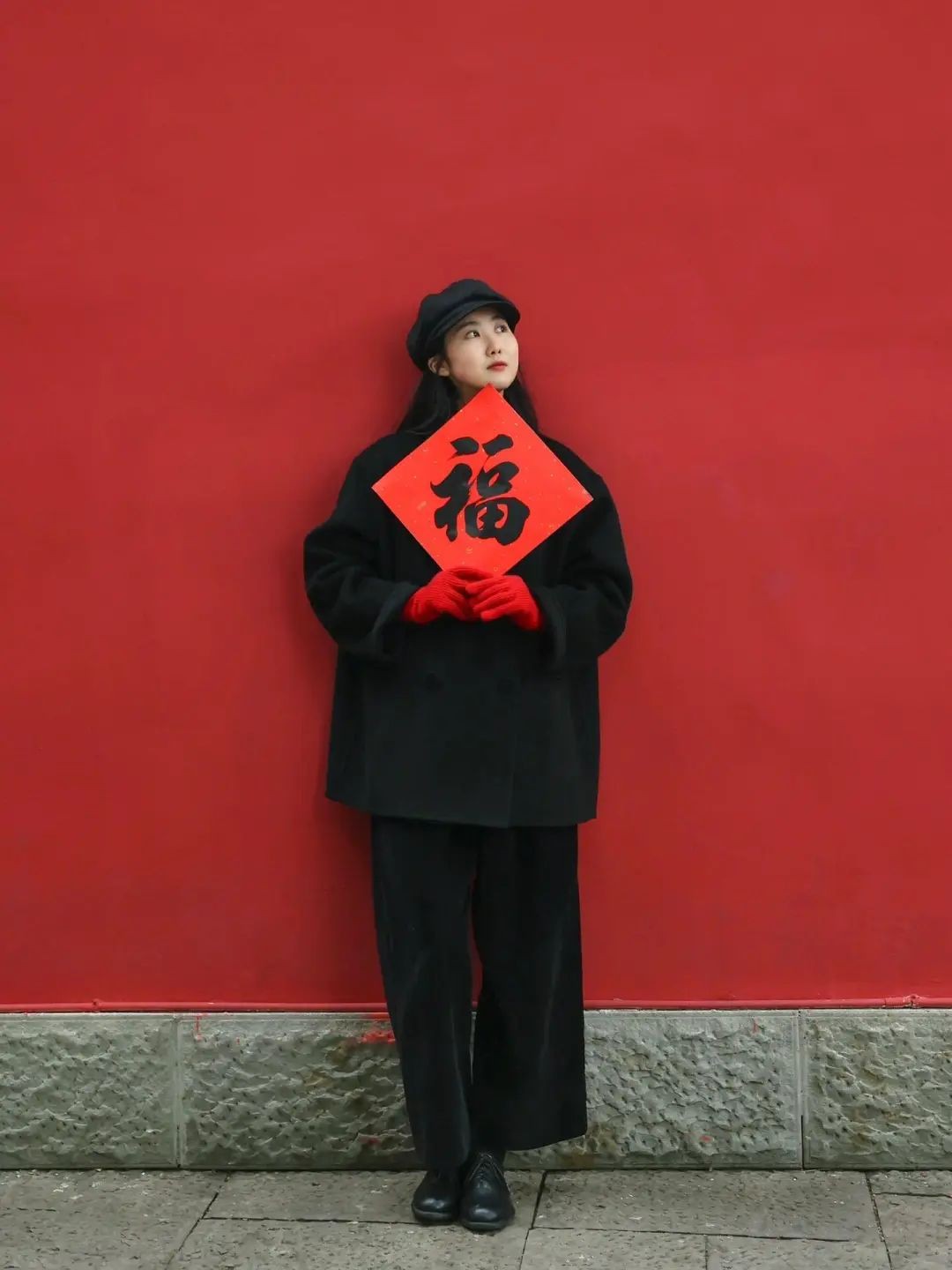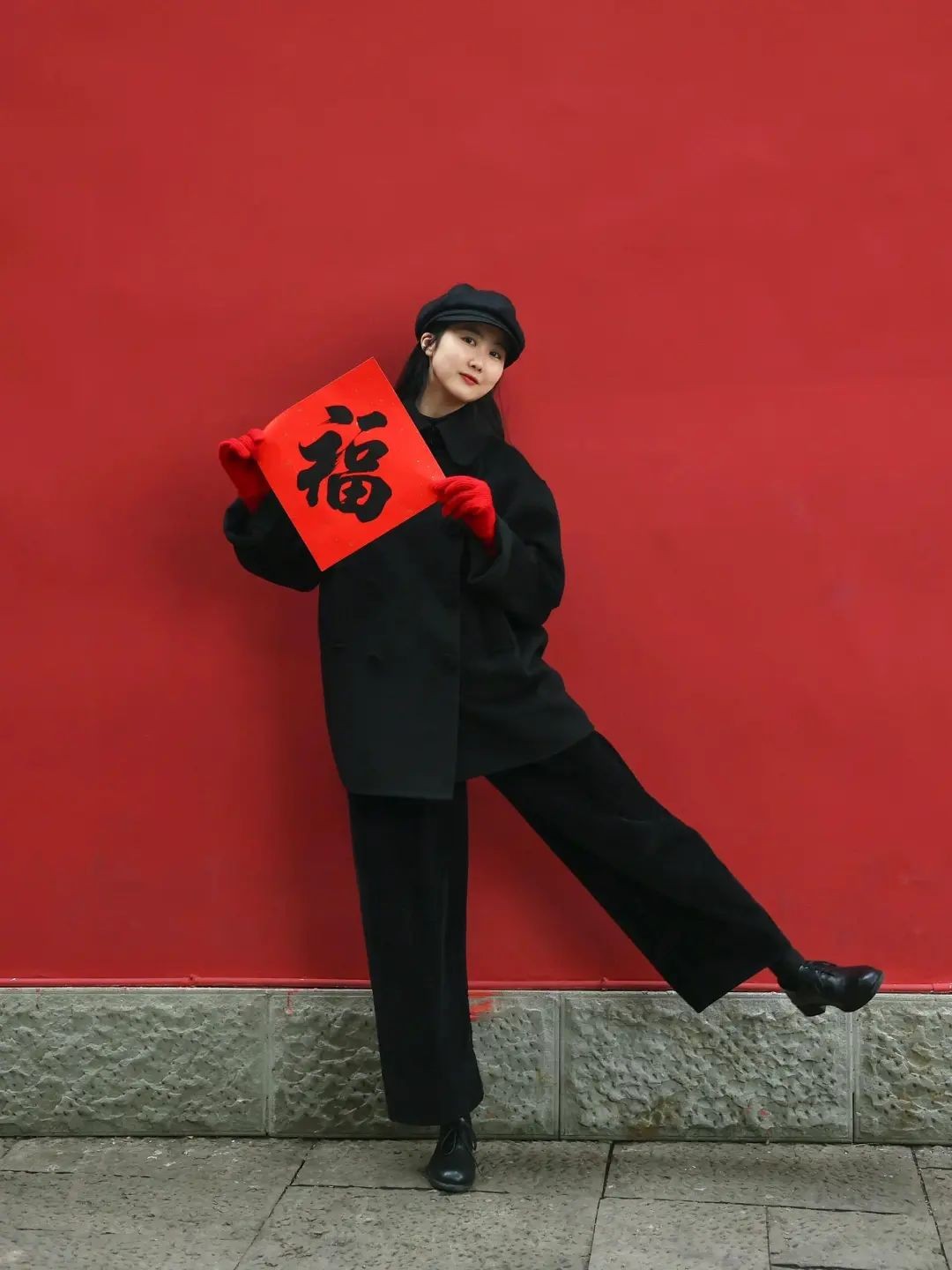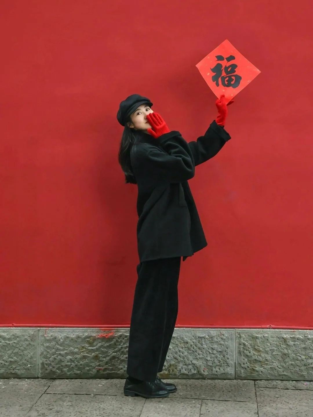 如果是找一面红墙拍照的话,不建议身上再大面积亮红色了,可以穿和红墙不一样的红色上衣,下装黑色、棕色或者白色;或者像我一样all black,再用红色手套点缀,对比会更强烈。