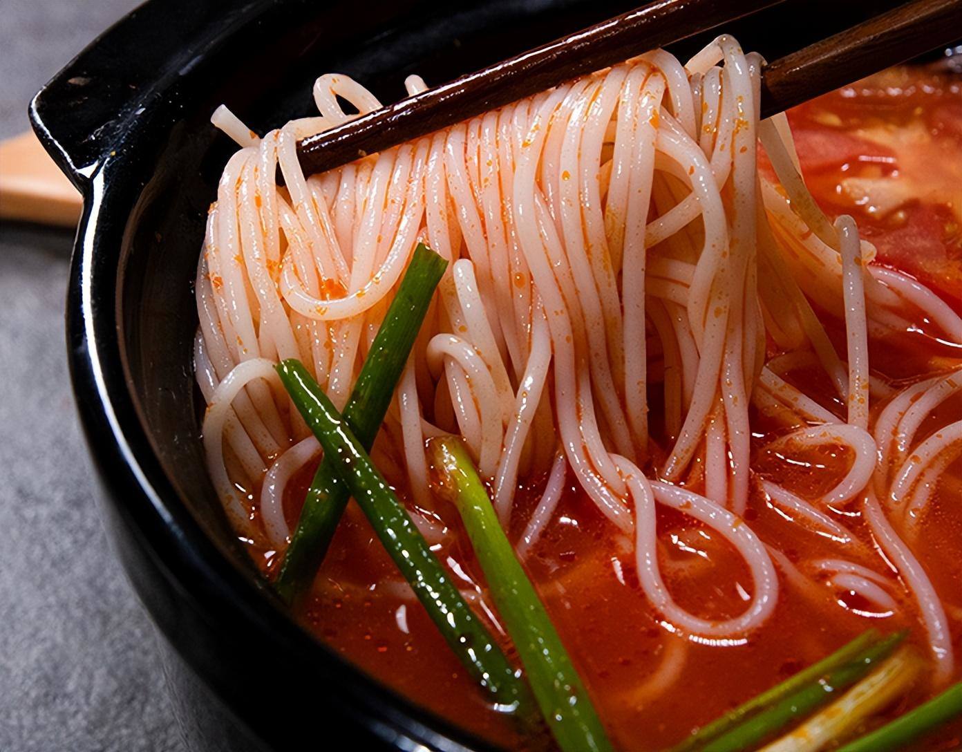 吃的时候先用一勺汤拌匀蘸碟,捞起锅里的米粉和配菜裹着蘸碟吃,汤底酸鲜开胃,米粉爽滑入味,吃完再喝汤,别提多舒服!而且作为核心底料的红酸,是天然发酵而成,不含添加剂,健康又美味。