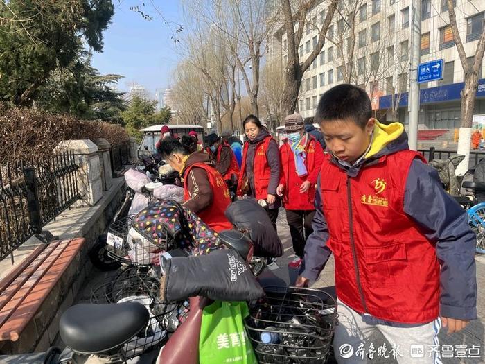 上午九点半,志愿者们在济南泉城广场东门处集合,虽然其中有不少60岁以上的老年志愿者,但大家十分积极,争先参与到整理非机动车的行列中。从泉城广场东门开始,40名志愿者分成两组开始工作,其中一组沿天地坛街往北进行整理,另一组沿黑虎泉西路两侧进行整理。