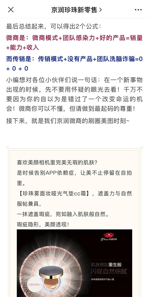 京润珍珠新零售官方公众号这样介绍传销,不知是自己无知还是故意引导。
