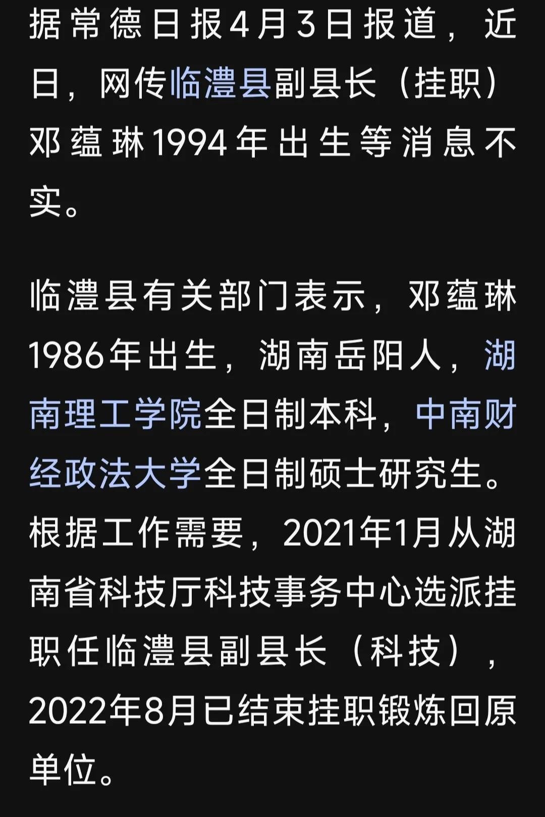 一、公开资料显示这位漂亮的姑娘叫邓蕴林,被保送上得北大,毕业后通过公考考入湖南省科技厅,工作两年后下派到湖南省常德市临澧县当副县长。她的简历就像一张白纸,干净利索,能描绘更好更美的图画,邓蕴林在职期间受到上下级官员的称赞,看来工作能力是蛮强的。昨天湖南《常德日报》辟谣,媒体报道的邓蕴林,1994年出生,保送上北大等消息不实,她是1986年出生,湖南理工学院本科毕业,后来上中南财经大学硕士研究生,最后公考入湖南省科技厅,原来女主比网上爆料的大了8岁,而且2022年8月已经挂职锻炼结束,又回到原单位。