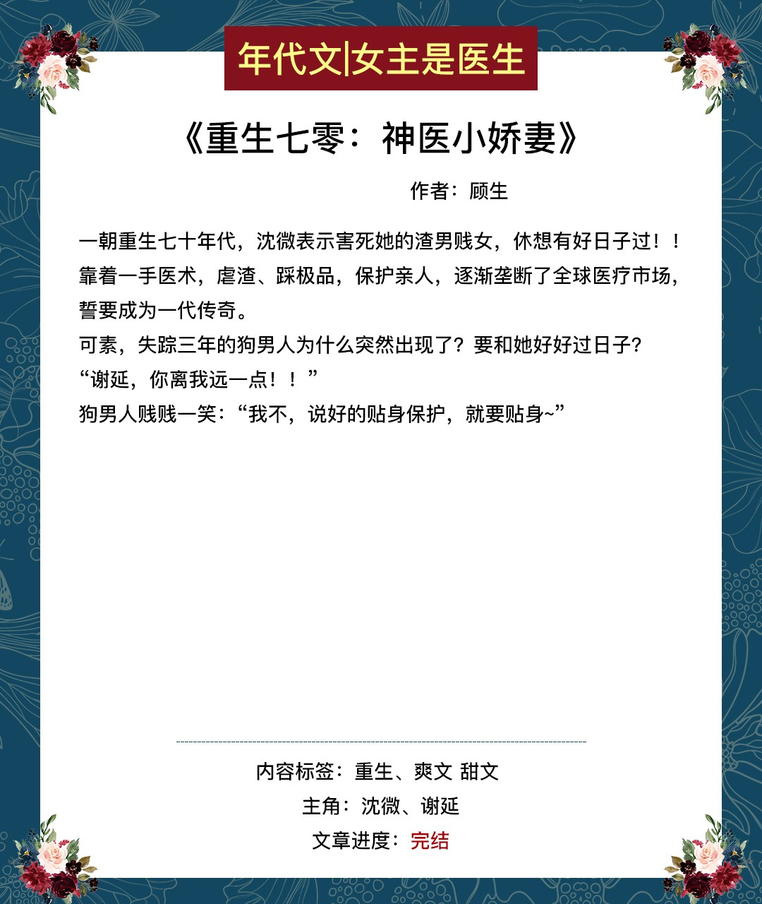 第六本《重生七零:神医小娇妻》作者:顾生