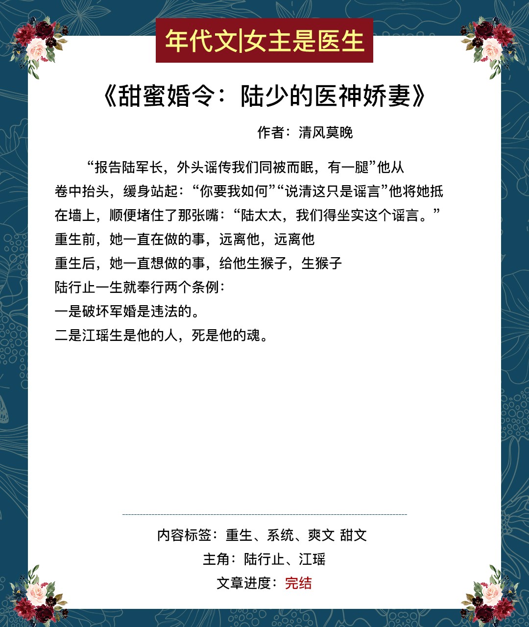 【短评】:女主重生,有医学系统,男主军人。故事很长,金手指很大,但就是好看到停不下来,感情线超级无敌甜!好看!
