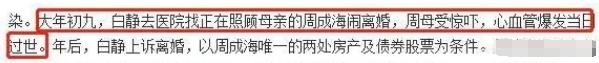 据说,她还曾大闹医院,年迈的周母因此受到了不小的惊吓,当天因心血管问题不幸去世。