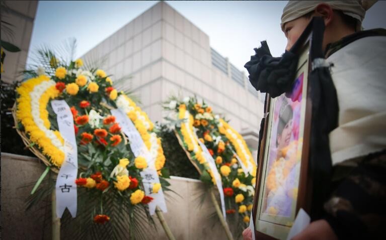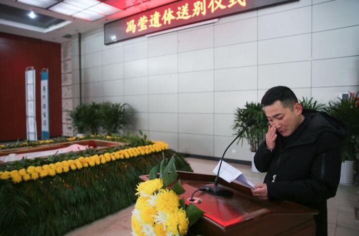 追悼会结束,当其他人都离开大厅后,杨海斌却站在莹莹的遗体和遗像前,久久不愿走开。