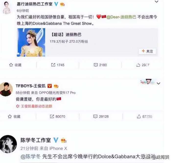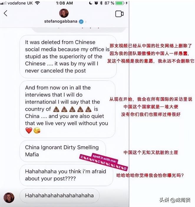 更令人气愤的是,杜嘉班纳的联合创始人兼设计师在与网友的对话中,使用了“无知又肮脏的土匪”等侮辱性词汇来形容中国,这番言论彻底激怒了中国网友,抵制杜嘉班纳的浪潮席卷而来。