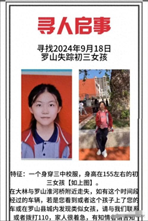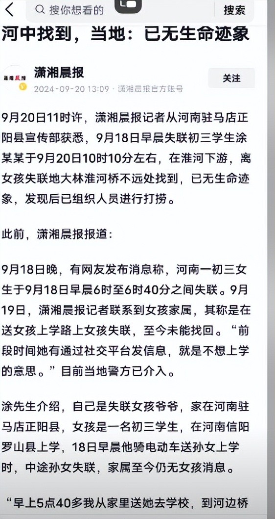 事件回顾:网上有传言说,河南有个初三的女生,在9月18号早上,她爷爷送她去学校的路上,就在正阳县和罗山县交界的大林淮河桥附近,她突然说她的书包掉了,紧接着又说她的钱也丢了。爷爷去帮她找的时候,回头一看,女孩就不见了。家里人和警察找了好久都没找到她。没想到的是,到了9月20日,在淮河下游,离她失踪的地方不远处,最终找到了她,可是她已经没有生命迹象了。