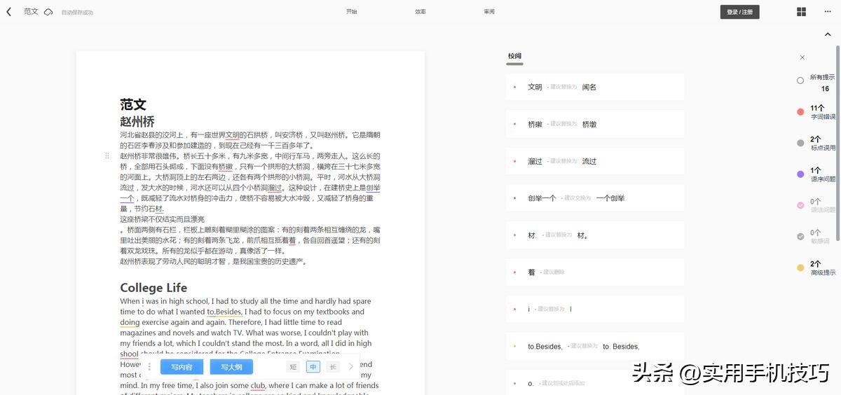 秘塔写作猫是新一代AI写作伴侣,它能根据上下文智能续写,写作没灵感的时候,这个自动续写功能可以应急用。它支持病句语法智能纠错,帮你纠正语句不通、错别字等问题。另外还有一键改写功能,语句意思不变,替换用词,把你的大白话变成优美的书面语言,让你的文章立马有格调。
