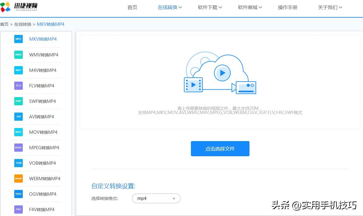 迅捷视频转换是一个转换视频格式的网站。它可以帮我们快速转换视频格式,支持MP4、MOV、AVI等10+种视频格式转换,文件最大支持20M,能基本满足日常需求了,如果文件比较大可以考虑安装客户端来进行转换。
