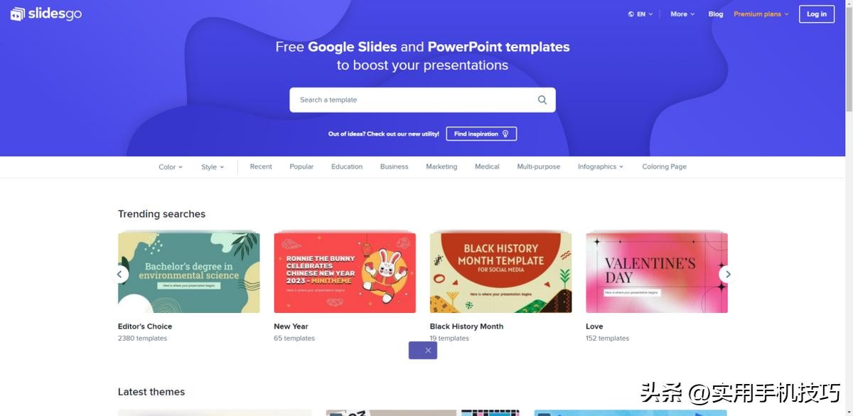 Slidego是一个提供高质量PPT模板素材的网站,风格多样,可按颜色、主题、风格等关键字筛选,涉及教育、艺术、商业等领域,画风精美,编辑简单。找到喜欢的模板后,点击进来可以看到更详细的模板介绍,还能够预览投影片。