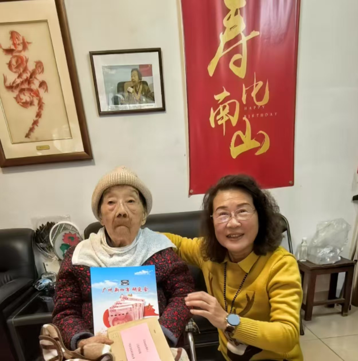 12月19日下午,阳光明媚。广州新四军研究会郑向明会长暨常务副会长许多、朱俊学,副会长兼宣讲团团长凌保平,二分会会长吴珉一行,来到广州竹丝二马路军休所,看望107岁高龄的新四军老战士陈星。