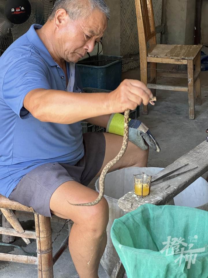 65岁的钱大叔有40多年的取蛇毒经验。去子思桥那天赶得巧,正好观摩了他取蛇毒的全过程。