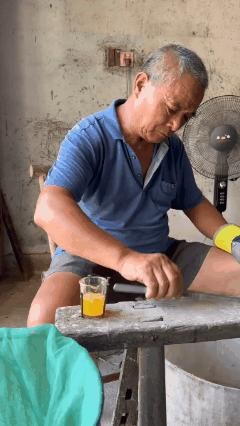 钱大叔左手戴手套,右手拿镊子,先利落地从塑料桶里夹起一条蝮蛇,左手精准掐住蛇七寸,右手接上、大拇指和食指捏开蝮蛇口腔,露出毒牙,磕在量杯上,轻轻一挤,鲜黄色的蛇毒便“滋”了出来。