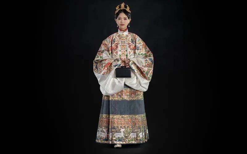 明华堂对汉服传统纹饰的研究与复原是其备受追捧的原因。2018年推出的“过肩蟒云肩通袖妆花织金纱”单品,从孔府旧藏明代服饰中获取灵感,采用了明代蟒龙、如意云、海水江牙等经典元素,并通过对金、青、红、白、黑五色的搭配运用,呈现出奢华、文雅的风范。在严格遵循传统服饰样式的同时,明华堂在袖长、袖宽,以及领口等的设计上,都会根据顾客的实际需求订制,只有这样才能让汉服使用场景更符合当代生活。