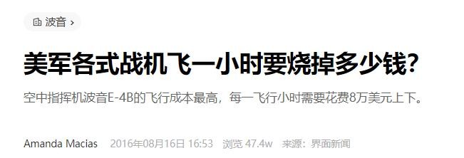 2016年08月16日,界面新闻,《美军各式战机飞一小时要烧掉多少钱?》