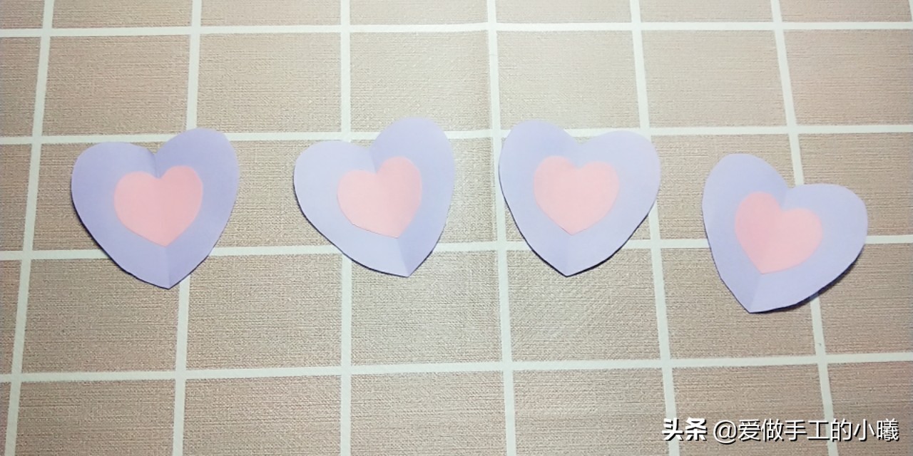 我们需要准备的材料有:一张正方形的纸,四个大一些的爱心,四个小一点的爱心,胶水。