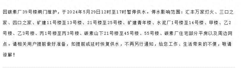 据吉林市水务集团消息,因碳素厂39号楼闸门维护,于2024年5月29日12时至17时暂停供水。停水影响范围:汇丰万家灯火、三口之家、四口之家、矿建11号楼至13号楼、21号楼至25号楼、矿建青年楼、水泥厂1号楼至14号楼、甲楼、乙2号楼、乙3号楼、丙1号楼至丙3号楼、碳素山下21号楼至45号楼、55号楼、碳素厂住宅部分平房以及周边网点。请相关用户提前做好准备,如提前或延时恢复供水,不再另行通知,给您工作、生活带来的不便,敬请谅解!
