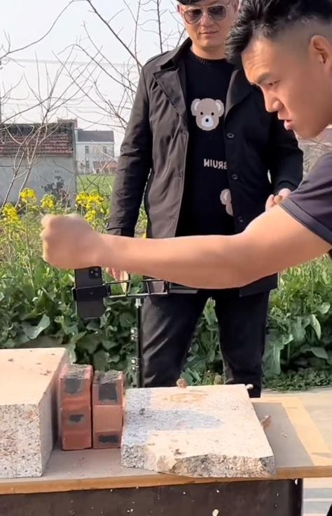 一个核桃两块砖,趁着核桃不注意的功夫,就用隔山打牛的功夫把砖劈成两半,而寸拳的要领就是既快又准,薄振亚的出拳速度也已经快到,甚至在镜头下都是模糊的。