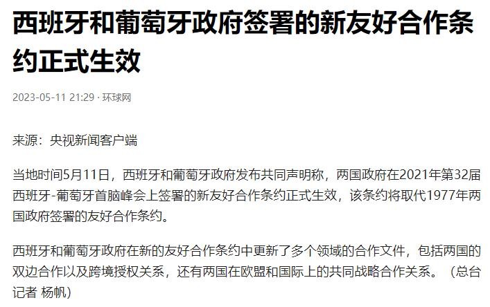环球网 西班牙和葡萄牙政府签署的新友好合作条约正式生效