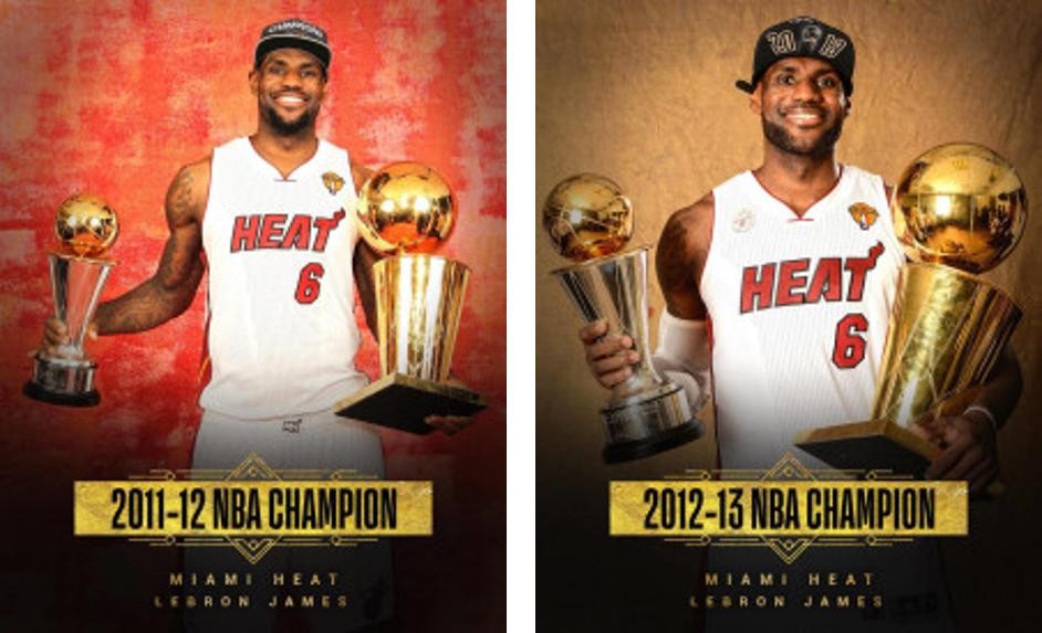 2011-12赛季,与总冠军失之交臂的詹姆斯,休赛期对自己进行了疯狂的训练,这一年的常规赛场均数据来到了27.1分、7.9个篮板和6.2次助攻,在投篮命中率、三分球命中率上均创造了个人生涯新高。凭借出色的表现詹姆斯第三次加冕常规赛MVP,这是他2008-2012赛季4个赛季第3次获此殊荣,同时成为继迈克尔-乔丹之后首位至少3夺常规赛MVP之人。这一年的总决赛面对稚嫩的雷霆,热火不太意外地拿到了那个赛季的总冠军,并且在2012-2013赛季凭借雷阿伦的3分和整体的出色发挥,有惊无险地拿下老练的马刺,成功卫冕总冠军。