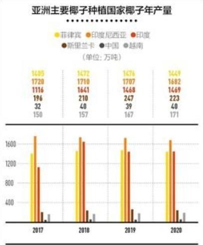 印度尼西亚主要是热带雨林气候和少量的热带稀疏草原气候,农业方面主要的经济作物有橡胶,咖啡,棕榈油,椰子,甘蔗,胡椒,奎宁,木棉,茶叶等。其中椰子产量世界第二【图28】,棕榈油产量世界第一【图29】等。